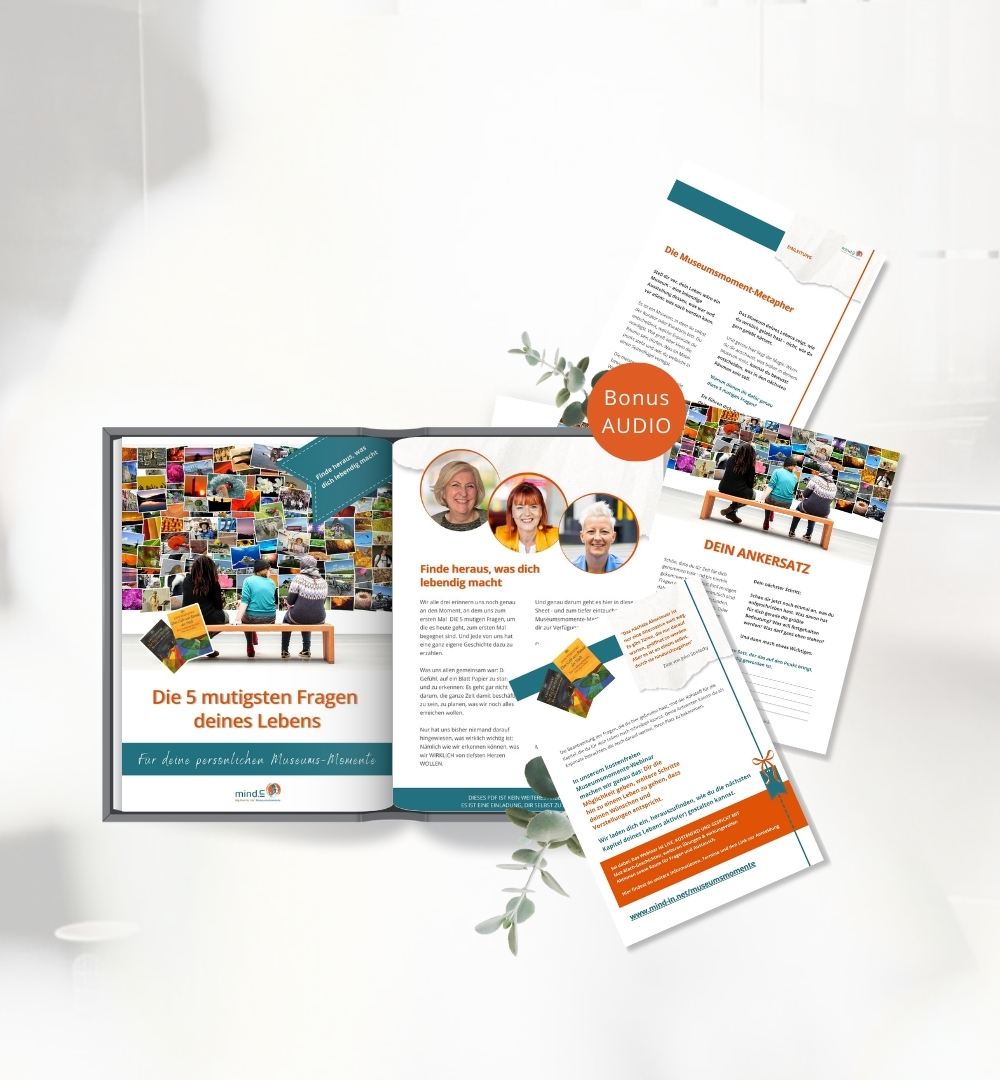 Beginne hier deine Reise und hol dir kostenlos dein Reflexions-Workbook mit 5 ungewöhnlichen Fragen, eine geführte Audio-Meditation aus „deinem Museum des Lebens“ und wertvolle Impulse, die dich weiterbringen.